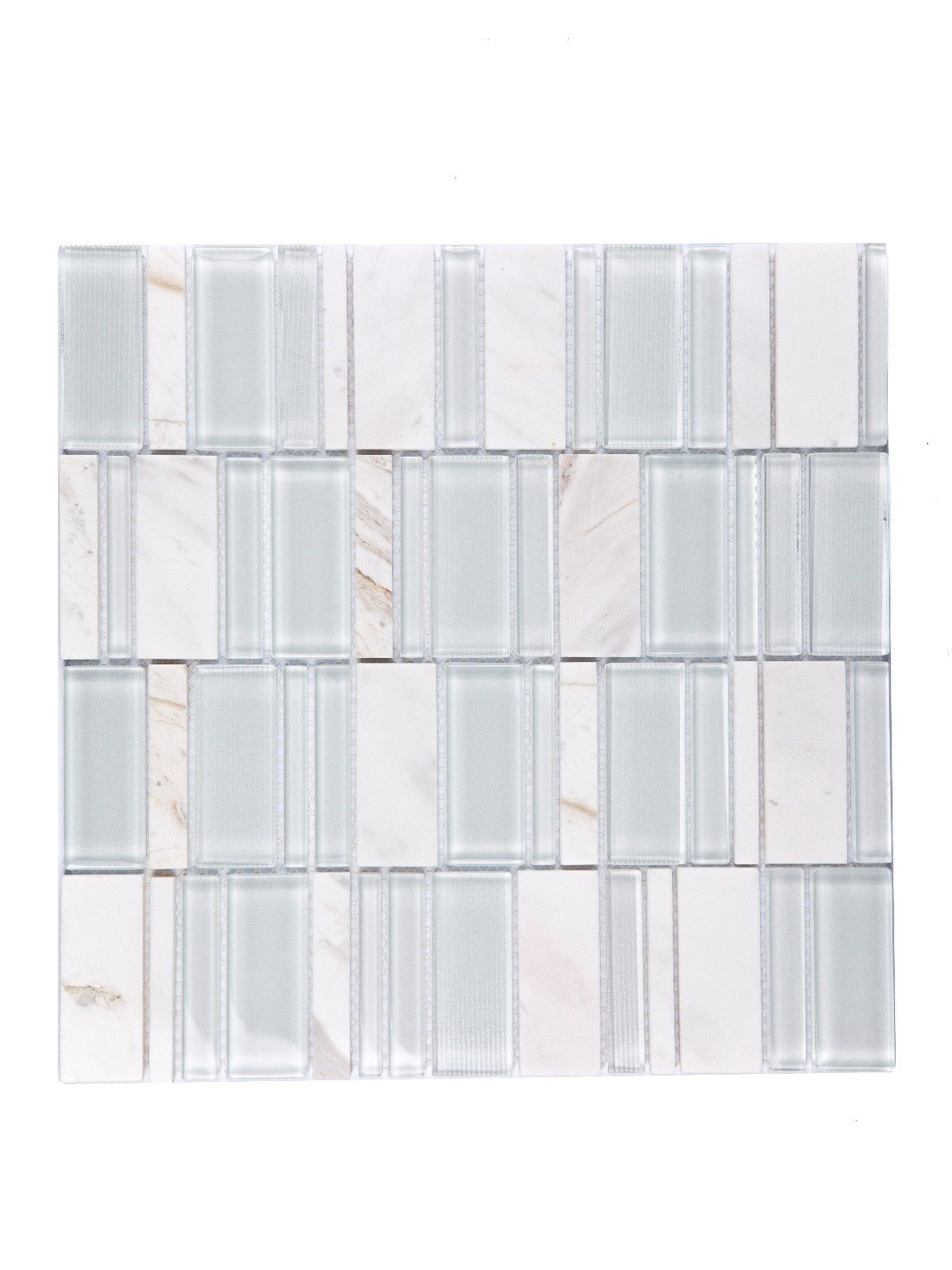 The clean lines and varied rectangular shapes offer a contemporary aesthetic, while the natural marble elements bring an organic, timeless appeal. The smooth glass reflects light, enhancing the brightness of the room, and the marble adds depth and character. Ideal for kitchen backsplashes, bathroom accent walls, or feature areas, this tile creates a focal point that is both stylish and refined.